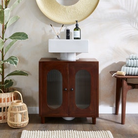 * Acacia Wood finish * 1 adjustable shelf * Glass front Crafted from high-quality acacia wood with reeded glass panels, this under sink unit exudes elegance and contemporary charm, making it a standout piece in any space. Featuring a spacious cabinet with adjustable shelves, this unit offers ample storage space for toiletries, cleaning supplies, or…