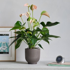 These futuristic looking houseplants are also nicknamed the flamingo plant – and we’re sure you can see why! Unapologetically flamboyant, they’re known for their waxy, peach coloured, heart-shaped leaves which are often mistaken for flowers. Native to the tropical rainforests of America, it loves humidity and isn’t too fond of the cold – so keep it away from any cold draughts! Otherwise, the Peach Anthurium is surprisingly low maintenance and easy to care for. Paired with a ribbed, perfectly-fitting ceramic pot and a Beards & Daisies sea salt & oakmoss scented candle – the perfect gift!**How to keep me happy:**